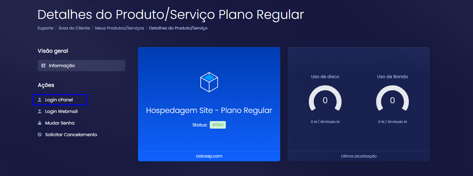 1. Faça login na sua conta de hospedagem e clique em Login Cpanel na tela de seu serviço.